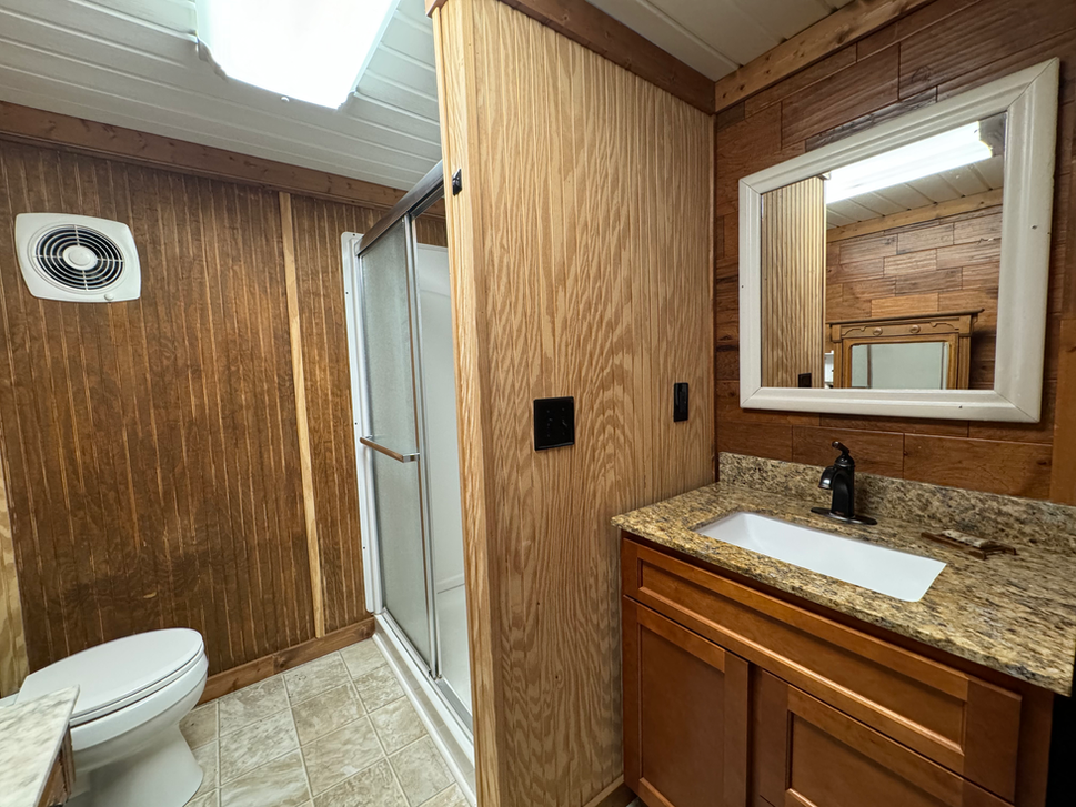 As you enter the Lakeside Loft, immerse yourself in panoramic views of the lake in the spacious living room surrounded by windows treated with privacy blackout shades. The shades almost disappear when they are not in use. The living room features a comfy new sectional sofa (not pictured yet), WIFI connected smart TV with Dish Network, a few games, and a full-size Murphy bed for extra sleeping room. There is also a convenient full bathroom with a walk-in shower. As you exit the living room take one step up to the dining room again surrounded with windows for more lake views. Next, you will enter the full kitchen stocked with dinnerware, cookware, dish soap, and paper towels. Right off the kitchen, you have the second full bath. As you exit the kitchen, you will find the main bedroom with a comfy queen bed with blackout shades. Next, go up the steps (be careful they are a little steep) to the double loft that kids will love with a king-size bed on one side and a full in the other loft. Hang out on the large layered deck with a powered awning that can be let out to provide shade with outside dining, a charcoal grill, and a fire pit. The Lakeside Loft has a dock to park a boat, fish, or swim. The Lakeside Loft is just a short walk to the pool! We only have a select number of chairs so feel free to bring your own!