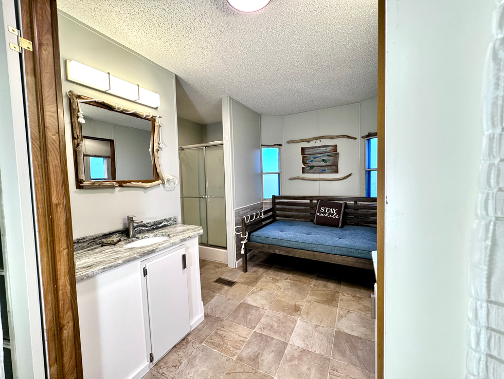 The master suite offers a king-size bed, a spacious attached bathroom, and a daybed (perfect for keeping small children close to parents—this is not counted in the bed total). All bedrooms have blackout shades for restful sleep. The rental also includes two full bathrooms for your convenience.