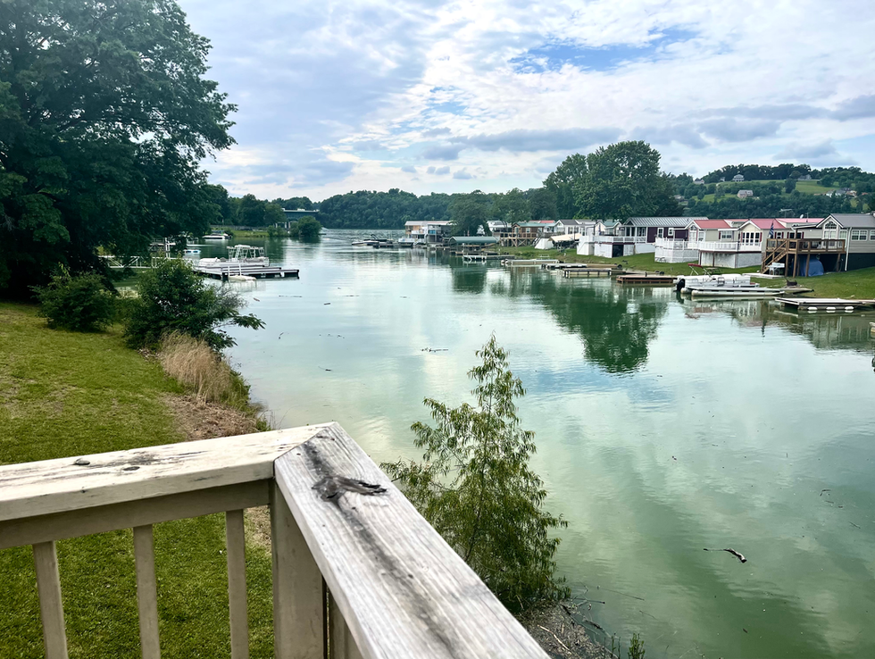 Experience a relaxing sunset on the deck overlooking the peaceful cove at our lakeside rental. Step inside to an open living area featuring a fully stocked, eat-in kitchen with dinnerware, cookware, and paper towels. The kitchen island seats six, ideal for family meals or casual gatherings. The cozy living room includes a large sectional couch, a WiFi-connected smart TV, and a full-size fold-out cabinet bed for extra sleeping space. For rainy days, enjoy a selection of board games.